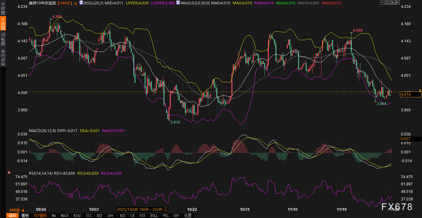 当前240分钟图的布林带(20,2)中轨位于4.011,与现价4.010高度重合,上轨4.039、下轨3.982形成明确震荡边界。价格紧贴中轨运行表明短期方向未明,但带宽收窄至5.7bp(上轨-下轨),预示即将选择方向。若突破上轨,则可能测试4.05%阻力;若跌破下轨,3.98%支撑或将接受考验。