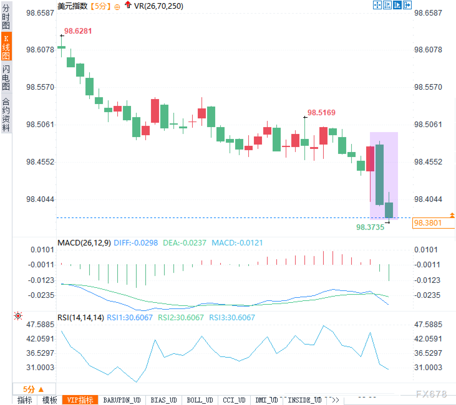 从5分钟K线来看,美元指数自98.6281附近高点一路缓慢走低,中途在98.5169一线形成短暂反弹后再度回落,刚刚创出98.3735的新低,目前价格整体仍处于低位弱势区间。MACD指标在零轴下方运行,DIFF与DEA均为负值,柱体在前期放大后略有收窄,体现空头主导但下跌动能有所钝化。RSI维持在30上下,处于偏超卖区域,说明短线抛压释放较多,价格对新增利空的敏感度下降。尾端K线长阴之后出现带下影的小实体,显示低位有一定对冲力量,但形态上仍未形成明确反转结构,短期仍以震荡偏弱解读。若后续能否收复紫色区间的快速下跌段,将是观察情绪修复程度的重要信号之一。